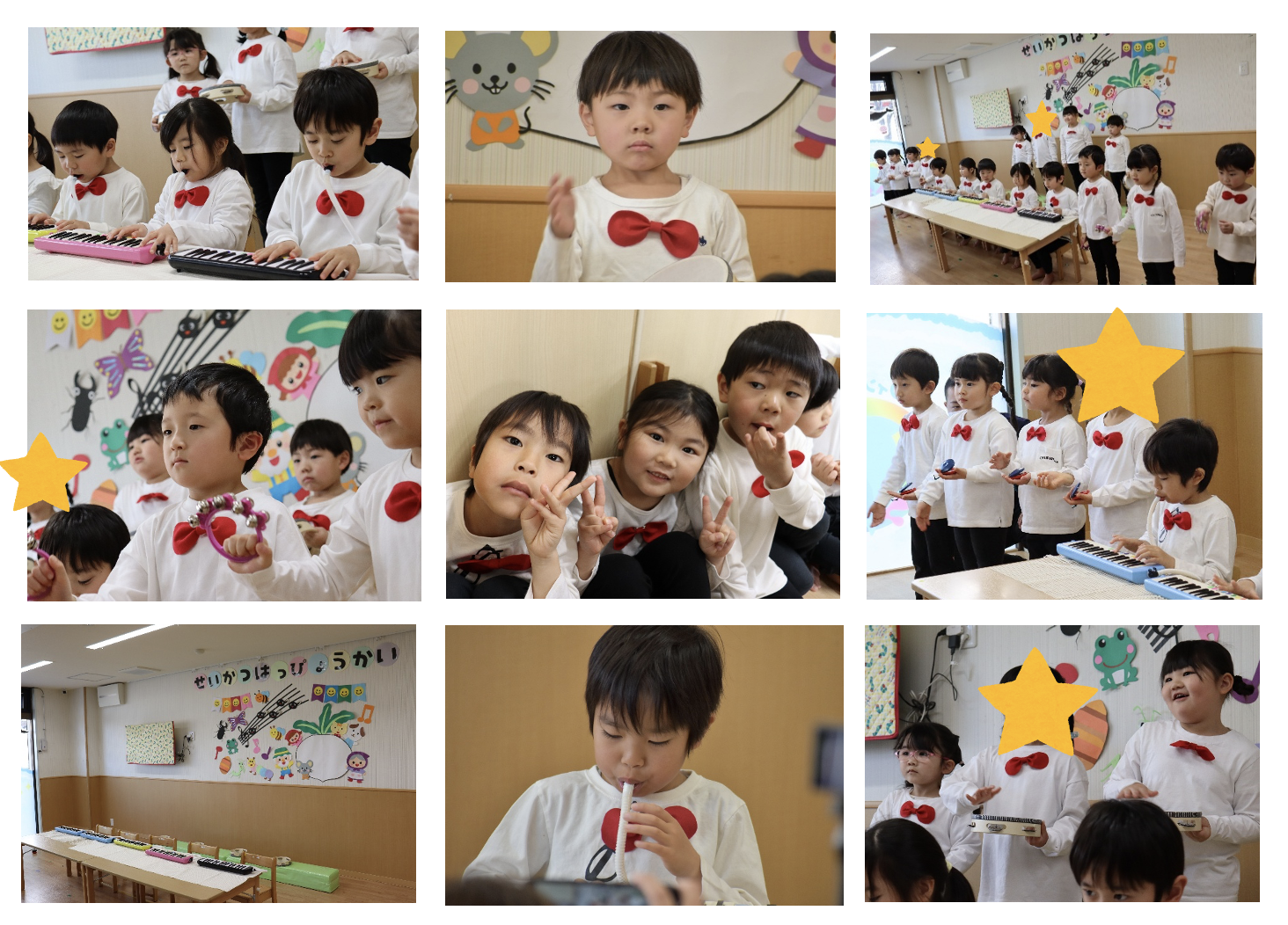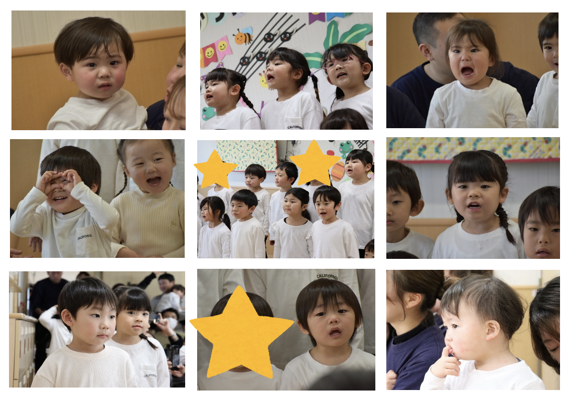 待ちに待った生活発表会!!いつもと違う雰囲気で不安になっていた子どもたちでしたが、保育者が声を掛けると緊張が緩み、笑顔が見られました😊