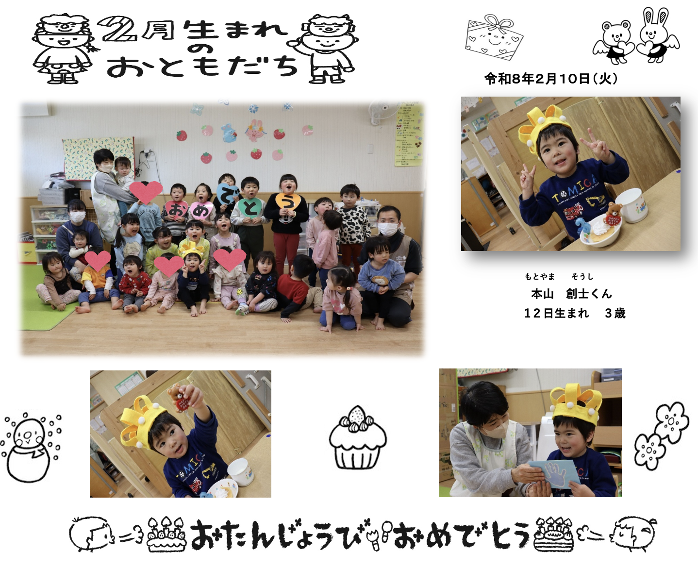 「2月生まれのお友達のお誕生日会をしました✨ 先生からのインタビューでは、ちょっぴり恥ずかしそうにしていました。みんなから、おめでとうや歌のプレゼントを貰うと、素敵な笑顔を見せてくれました! 最後はホットケーキをほおばり、思い出に残るお誕生日会になりました💕 今年度、全員が誕生日を迎え、また一つ素敵なお兄さん、お姉さんになりました! これからもたくさん遊んで、元気いっぱいにすごしてね😊