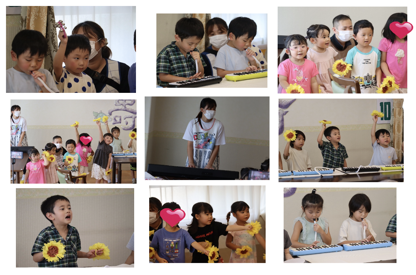 年長さんはピアニカ、年中さん年少さんはタンブリンやすず、カスタネットを担当しそれぞれの楽器に心を込めて練習を重ねてきました。